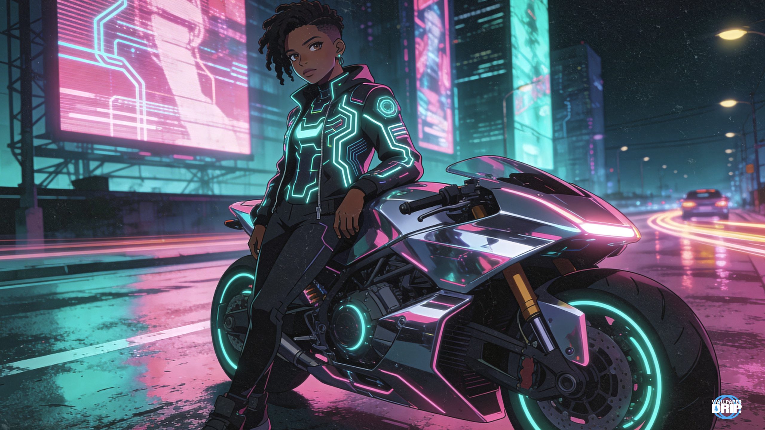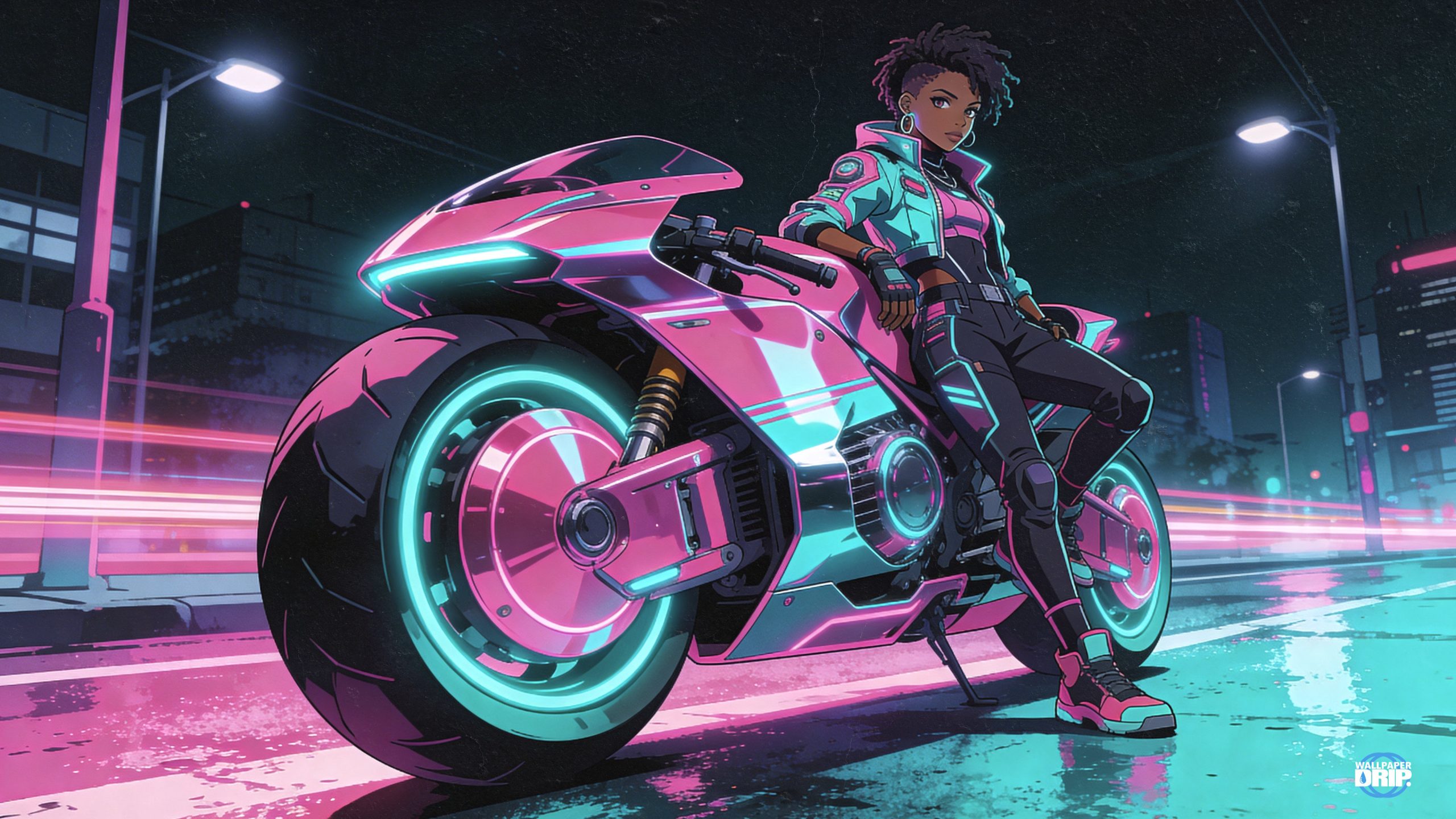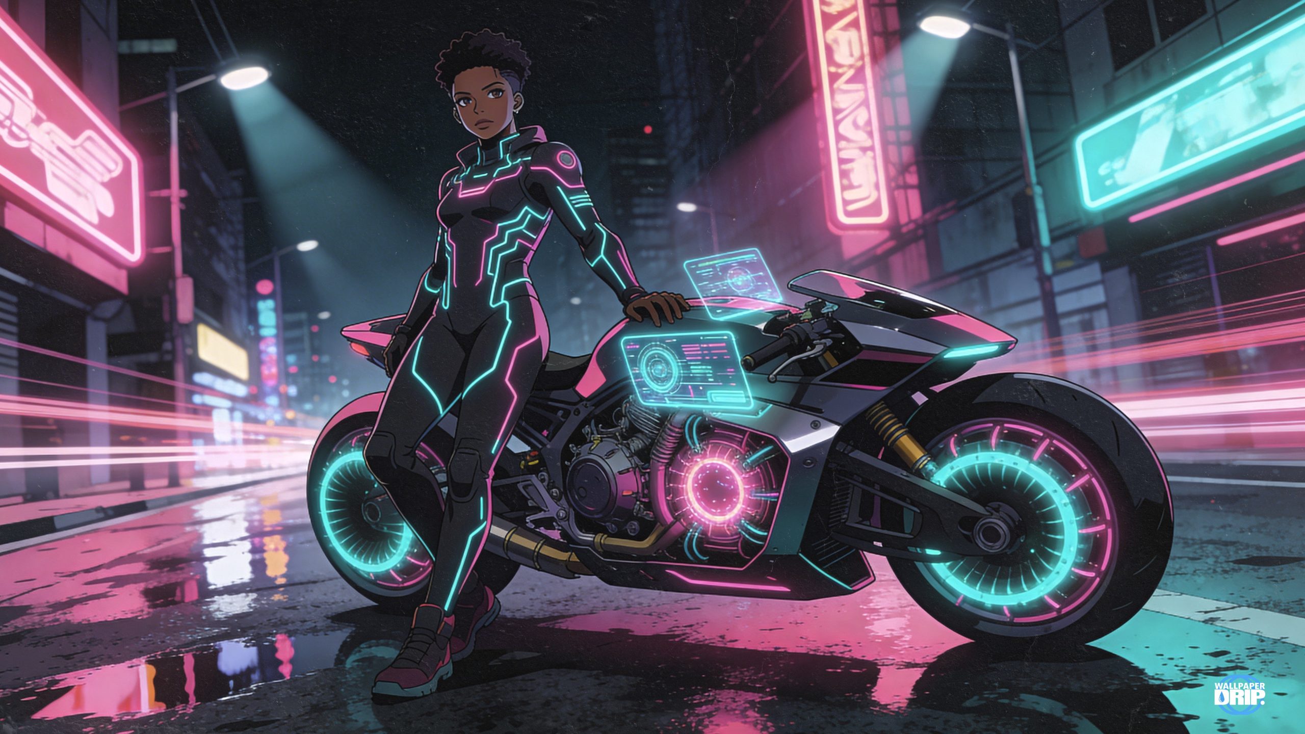 Bring cyberpunk energy to your desktop with this high-resolution wallpaper featuring a fearless street racer and her glowing futuristic superbike. Electric pinks and cool teals light up your workspace, while rain-soaked reflections add depth and cinematic atmosphere.